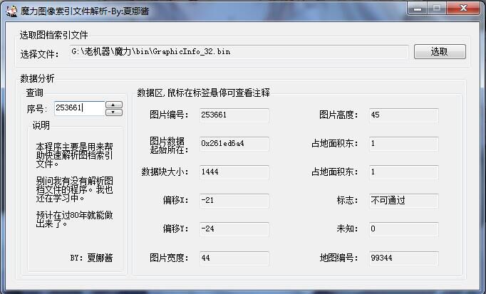 默默无闻潜水8年,最近有点时间,就研究了一会图档。虽然还没搞明白很多东西。总之,图档索引怎么解析我基本搞明白了。然后就做点贡献吧。写了一个工具来解析。用处其实不大。不过对于习惯看索引文件来计算图档起始地址的人来说可能会比较方便。 + }# p$ s! K! c. p7 i; F