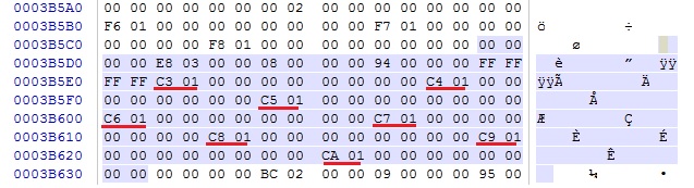所以要從 a.bin 偏移 0x0059FC00 開始讀取 0x0040 個動作資料,每個動作資料開頭結構 12 Bytes 分四部分