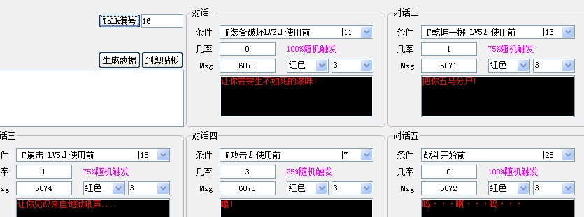 因为修改Talk文件总感觉怪怪的。。。例如技能四。。。技能五。。。是什么触发。。。如果知道是什么就不用手动去找关联了。。这样节省大部分编辑时间妖城在线论坛4 ]3 Y! K" w0 O: X2 l