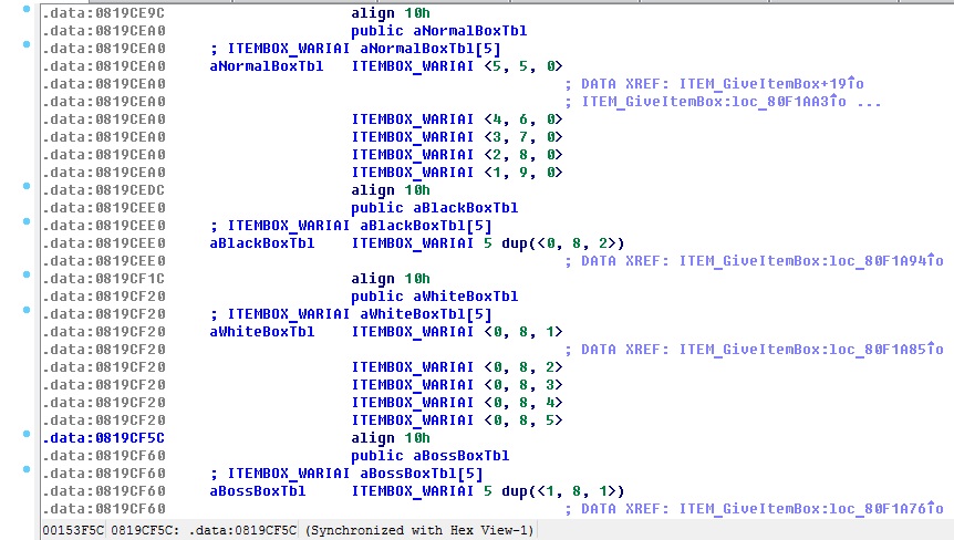 大家可以把这3个地址改成不同的物品 那么普通宝箱0~4这5个数字内的物品就会随机出现你改的3个物品(出现的数字、数量完全随机)