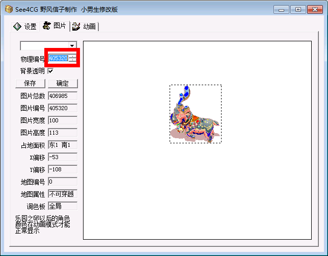 & F% t9 A( q- n9 M0 |—魔力私服,魔力宝贝私服技术,DELPHI编程,魔力寶貝, 魔力宝贝, 크로스게이트,クロスゲート打开See4CGW2 选择临时端的根目录,点击应用,然后在图片和动画选项卡,点开下拉框,找到骑士与歌妓,然后在物理编号那里用上下箭头找到需要做成补丁的动画和相应的图片,记录下物理编号,以圣诞驯鹿为例子图片与动画的物理编号记录如下。